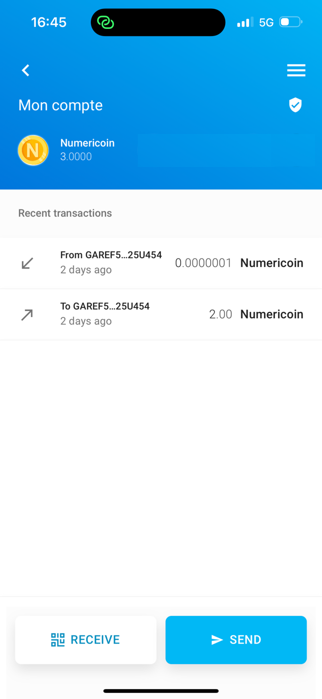 Vous pouvez envoyer et recevoir des Numéricoin® instantanément depuis votre smartphone via l'application SOLAR WALLET qui est disponible sur l'App Store et sur Google Play. Pour cela, choisissez d'importer votre compte Stellar ("Import Account").